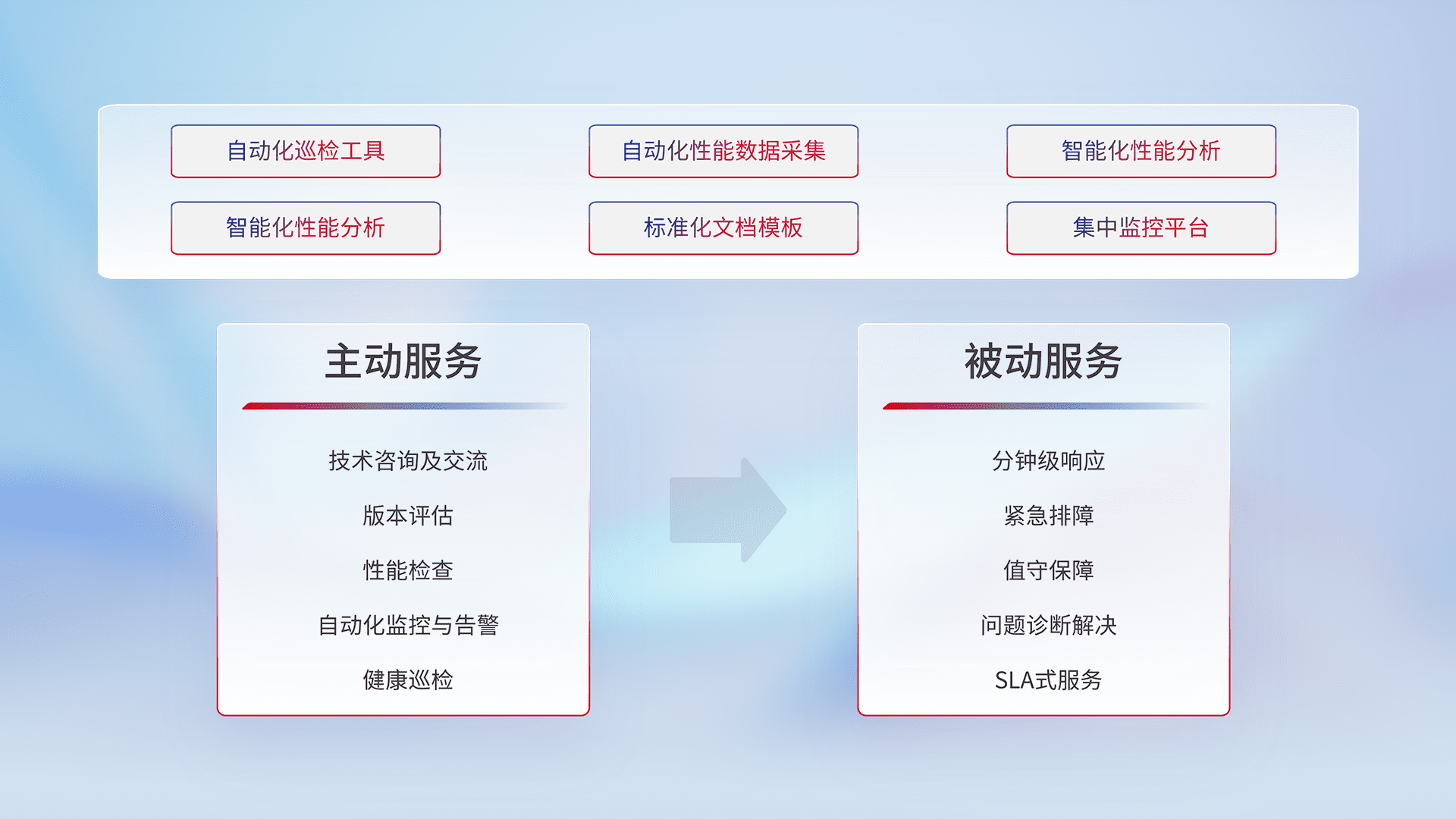 智能化工具和标准化文档,,,保障服务质量,,提供主动服务(包含技术咨询、、版本评估、、性能检查、、、自动化监控与告警、、、健康巡检)和被动服务包含(分钟级响应、、紧急排障、、、值守保障、、、问题诊断解决、、SLA服务)。。。